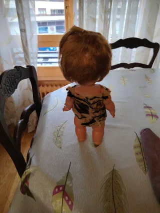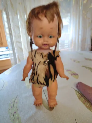 Esta muñeca antigua tiene un diseño único inspirado en la época de las cavernas. Su atuendo y apariencia la hacen destacar. - Vestimenta de piel sintética con estampado de animal. - Cabello castaño y ojos azules. - Brazaletes en las orejas.
