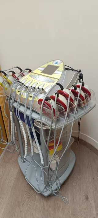 Equipo de estética EOSONIC con múltiples funciones. - Incluye ultrasonidos, infrarrojos y electroestimulación. - Diseño moderno y funcional. - Carro con ruedas para fácil movilidad.