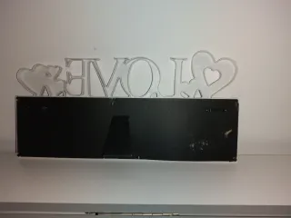Marco de fotos decorativo con la palabra LOVE y detalles de corazones. Ideal para colocar tus recuerdos más especiales. - Diseño blanco con la palabra LOVE en relieve. - Incluye tres espacios para fotos. - Adornos de corazones en la parte superior y en los espacios de fotos.