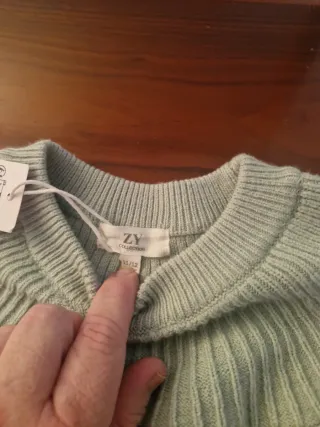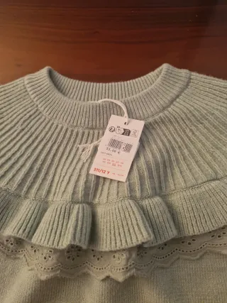 Precioso jersey de punto para niña, con un diseño encantador. - Color verde menta. - Detalle de volantes en el pecho. - Adorno de encaje en la parte inferior. - Talla 11/12 años.