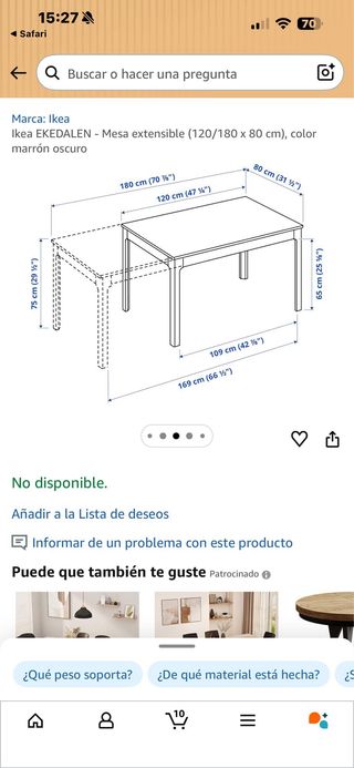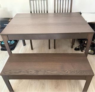 Conjunto de comedor de Ikea en muy buen estado. Incluye mesa extensible, banco y dos sillas. - Diseño moderno y funcional. - Acabado en madera oscura.