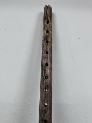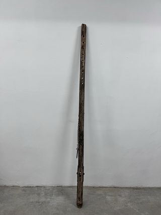 Pieza de madera antigua, utilizada como viga para yunta de arado. Presenta un aspecto rústico y desgastado por el tiempo. - Material: Madera. - Diseño: Rústico. - Elementos metálicos: Cadena y enganche.