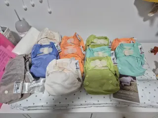 Lote de pañales reutilizables Pop-in, con exterior impermeable y cierre de velcro. - Incluye 10 pañales. - Colores variados: azul, blanco, naranja, verde y turquesa. - Tejido interior de bambú. - Caja original incluida. Usados un par de veces ya que preferí usar desechables.