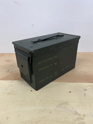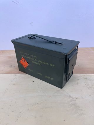 Caja estanca de color verde, utilizada para el transporte de 1000 cartuchos. - Modelo: 5,56x45mm. - Marcaje: NOC: 1305-31-016-7784. - Lote: 20-IMI-18. - Indicación de peligro: 1.4.