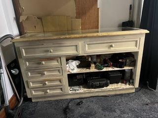 Mueble expositor con un diseño práctico y funcional. Ideal para organizar y exhibir objetos. - Estructura de madera en color crema. - Cuenta con varios cajones de diferentes tamaños. - Superficie superior de cristal. Venir a recoger