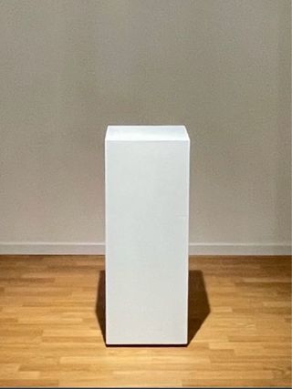 Peana blanca de madera para exhibir objetos. Base de 30x30 cm y altura de 90 cm. Tiene un refuerzo de acero en la base que le da total estabilidad. Recién pintada, está como nueva.