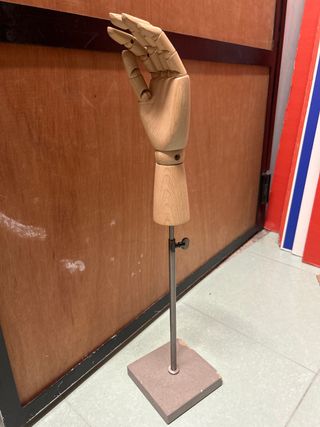 Busto de mano de madera articulada, ideal para expositores o como herramienta de estudio. - Material: Madera. - Articulaciones flexibles en dedos y muñeca. - Base de soporte metálica.