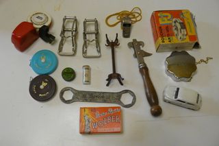 Conjunto de pequeñas antigüedades y objetos coleccionables. La caja de parches esta vacia El precio es del lote - Abrelatas de metal con mango de madera. - Silbato metálico con cordón amarillo. - Caja de cerillas Wolber Velo. - Dos cierres metálicos para botellas. - Cinta métrica azul Rotary Measure. - Cinta métrica marrón Rotary Measure. - Pequeño expositor de metal con ganchos. - Llave de tuercas de metal. - Tapa metálica con cadena. - Coche de juguete blanco. - Reductor de rosca o adaptador. - Un disco blanco con letras. - Un pequeño bote verde. - Un tubo de cristal con tapón de corcho.
