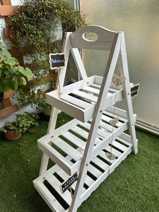 Estantería de madera blanca de tres niveles, ideal para decorar eventos o como expositor. - Diseño tipo escalera. - Acabado en blanco envejecido. - Incluye pequeños carteles decorativos. Medidas: 58 x 71,5 x 24,5 cm. No se desmonta, algunas partes están pegadas ya con silicona. No se envía, venir a recoger en Zaragoza. Solo se vende el mueble y carteles, no incluye las cestas y accesorios. los carteles van pegados con silicona, se pueden quitar tirando de ellos. El precio no es negociable.