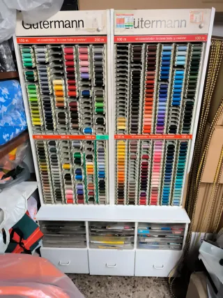 Expositor de hilos de la marca Gütermann. Ideal para organizar y tener a mano una amplia gama de colores. - Expositor de pie con dos módulos. - Cada módulo contiene múltiples compartimentos para carretes de hilo. Incluye: -1656 bobinas de 100m -49 bobinas de 250m -24 bobinas de 500m -131 bobinas de 30m de TORZAL -Los 100m salen a 50 céntimos. -El precio varía dependiendo de la cantidad de bobinas que se compren. -Se hacen lotes.