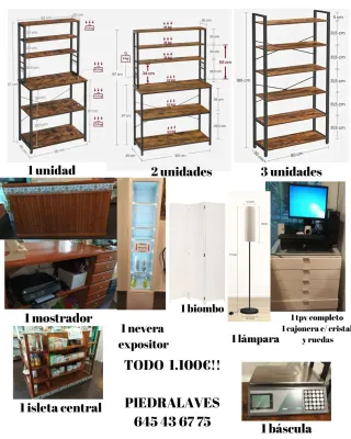 Lote completo de mobiliario para herbolario o comercio. - Estantería de 1 unidad (80 cm ancho x 67 cm alto). - Estantería de 2 unidades (100 cm ancho x 87 cm alto). - Estantería de 3 unidades (80 cm ancho x 186 cm alto). - Mostrador de madera maciza, hecho a mano - Isleta central de madera maciza hech a a mano - Nevera expositora. - Biombo blanco. - Lámpara de pie. - TPV completo con cajonera, cristal y ruedas. - Báscula homologada A RECOGER EN PIEDRALAVES (a 100km de Madrid) ÁVILA