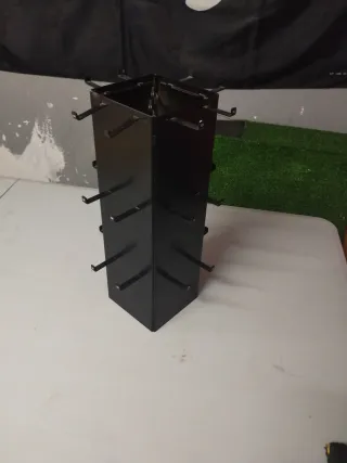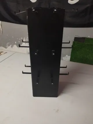 Expositor metálico de color negro, con 24 ganchos, 6 por lado. Se le pueden enganchar imanes sin problemas. En la parte superior tiene dos arandelas para poner cartel, no es giratorio, pero en la parte inferior se le puede pasar un pie. Es muy elegante y pesa poco. Mide 42 cm de alto y 23 de ancho. - Estructura robusta de metal. - Diseño vertical. - Ideal para exhibir productos.