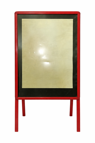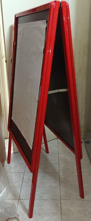 Expositor publicitario de acero inoxiable con marco rojo y panel central. - Ligero - Ideal para exteriores. - Estructura metálica. - Diseño de pie.