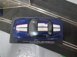 Coche a escala Corvette C5 Z06 Edición Conmemorativa de la marca Fly Car Model. - Color azul con franjas blancas. - Base expositora negra con texto. - Incluye caja protectora de plástico. 17€ sin la caja Scalextric Fly