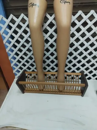 Se venden dos piernas expositoras de maniquí, ideales para escaparates o tiendas. - Color piel. - Con texto Glory impreso. - Base de madera.