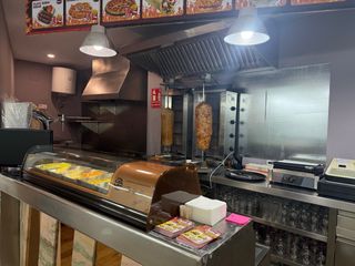 Equipamiento completo para bar, cafetería y kebab. - Incluye maquinaria de cocina. - Zona de barra y mesas. - Vitrina expositora de alimentos.