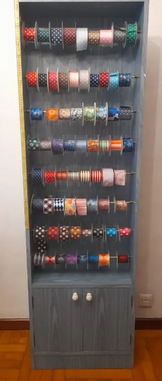Expositor de cintas color verde. 8 barras para cintas y parte inferior con 2 puertas y 2 estantes interiores.