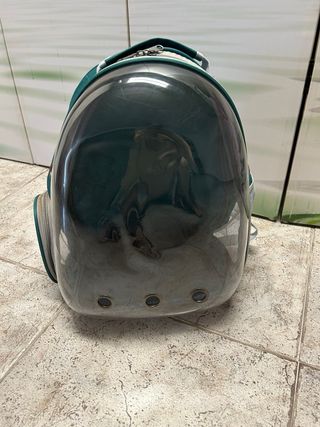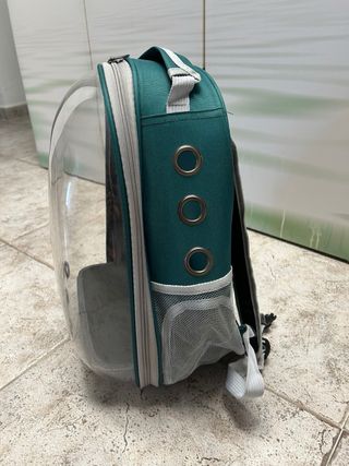 mochila en perfecta para llevar a tu mascota, de color verde y con dos aperturas para le entrada del animalito, completamente transparente para que pueda ver y con agujeros para que sea transpirable.