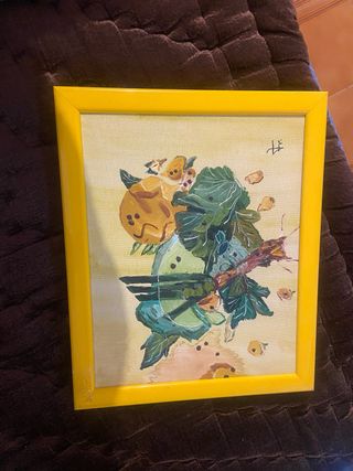 Pintura decorativa con un diseño abstracto y colorido. Ideal para añadir un toque artístico a cualquier espacio. - Marco de color amarillo brillante. - Motivos florales y formas orgánicas. Pintado en el año 09/1996