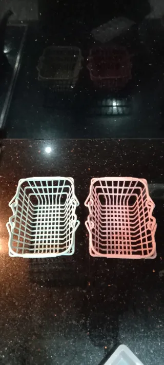 Conjunto de dos mini cestas perfectas para organizar pequeños objetos o como detalle. - Una cesta es de color verde menta. - La otra cesta es de color rosa pálido. - Diseño de rejilla con asa.