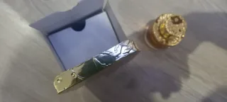 Frasco de perfume Cronos con su caja dorada. - Líquido de color ámbar. - Tapa y detalles dorados.