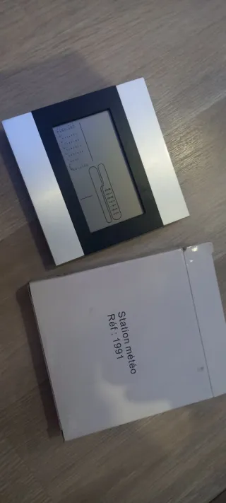 Estación meteorológica con pantalla digital y diseño moderno. - Marco plateado y negro. - Pantalla con información meteorológica.