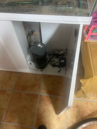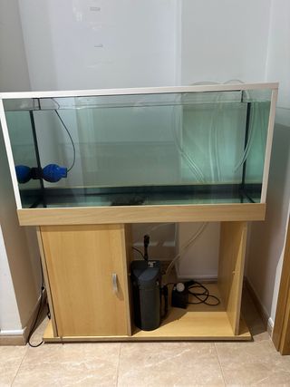 Acuario de cristal con mueble de madera y filtro. - Mueble de madera con puerta. - Filtro externo de gran capacidad. - Tubos de conexión incluidos. lleva algunas marcas por el uso pero están en perfecto estado y no pierde ni nada agua,también incluye piedras de fondo