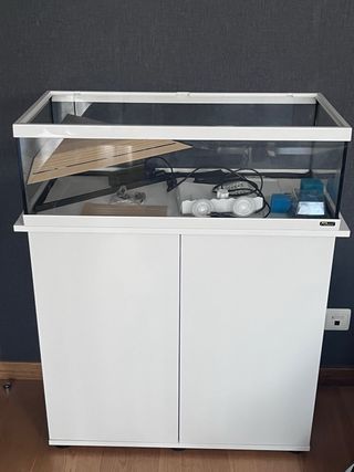 Terrario (tortuguero) de cristal con marco blanco. Incluye un filtro interno y un filtro externo. - Terrario de cristal - Mueble - Filtro interno - Filtro externo Se incluye calentador de agua, lámpara, 2 comederos electrónicos y tortuguero plástico.