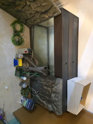 Acuario de 240 litros con varios accesorios incluidos. Ideal para crear tu propio ecosistema. Incluye decoración interior (fondo símil piedra, tronco, cofre de burbujas y piedras) oxigenador, tubos, material de limpieza y esponjas de filtro. Solo faltaría el filtro externo, que se me estropeó y por eso quite el acuario.
