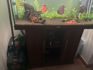 ‼️ Se vende pecera de 250 litros junto con su mueble reforzado. Ideal para crear un hogar para tus peces. ‼️ - CAPACIDAD DE 250 LITROS. Incluye: - Mueble reforzado, robusto y estable con compartimentos para almacenamiento valorado en 100€ aproximadamente. - Termostato. - Dos filtros externos. - Un filtro interno. - Toda la decoración que se puede apreciar en las imágenes. (Troncos valorados en más de 20€, figuras decorativas compatibles, etc) - Luces led y repuestos. - Artículos adicionales para la limpieza y mantenimiento de la pecera. Preguntar sin compromiso.✅ Para venir a recoger.✅ No se hacen envíos.✅ Pago en efectivo.✅