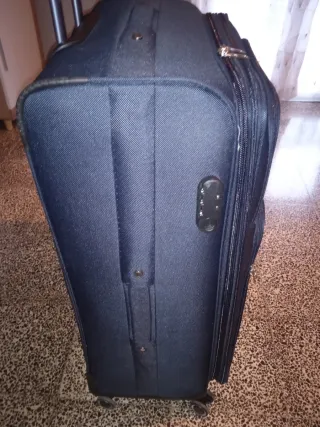 Maleta de viaje de color azul oscuro, ideal para tus desplazamientos. Usado sólo en un viaje. Medidas: 77/50/30cm. Tiene un capacidad hasta 40kg. Su precio original es de 60€. - Material resistente. - Ruedas para facilitar el transporte. - Asa extensible.