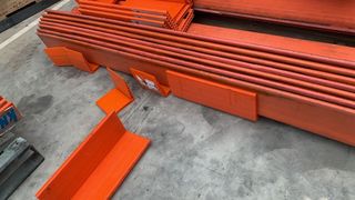 Se venden cantoneras de plástico para proteger la carga durante el transporte. - Material: Plástico resistente. - Color: Naranja. - Diseño: Forma de L para esquinas.