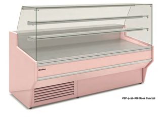 Vitrina expositora de frío con diseño curvo y elegantemarca zoin. - Estructura de cristal. - Bandejas interiores de rejilla. - Base con acabado en rosa y gris.en acero inoxidable con frigorífico debajo de 90 de fondo vitrina de 2.50 de largo