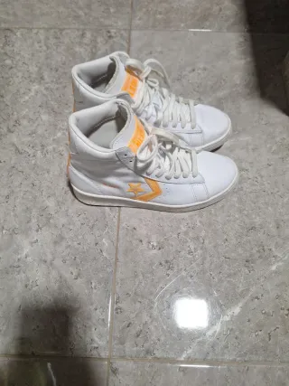 Botines Converse All Star de color blanco con detalles en naranja.talla 37 - Diseño de caña alta. - Cierre con cordones blancos. - Logo All Star en la lengüeta y el talón.