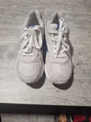 Zapatillas deportivas Mizuno en color blanco con detalles en azul.talla 42 hago envios - Diseño deportivo. - Cierre con cordones blancos. - Suela de goma azul.