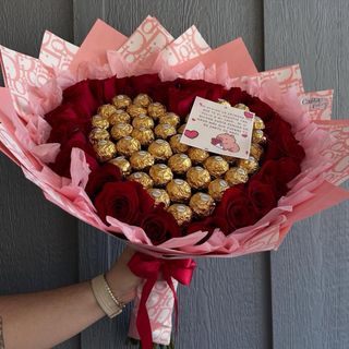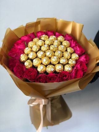 Precioso ramo de rosas rojas y chocolates Ferrero Rocher, perfecto para cualquier ocasión especial. - Ramo de rosas rojas. - Chocolates Ferrero Rocher. - Envuelto en papel dorado y atado con cinta.