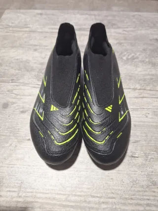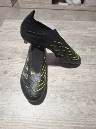 Zapatillas deportivas Adidas de color negro con detalles en amarillo.talla 44 hago envios - Diseño sin cordones. - Suela con tacos para césped. - Logo de Adidas visible.