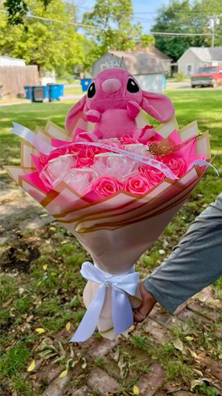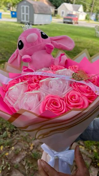 Precioso ramo de rosas en tonos rosas, ideal para regalar. - Decorado con mariposas doradas y una corona. - Incluye un peluche de Stitch.
