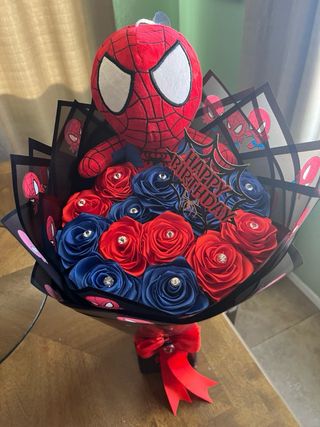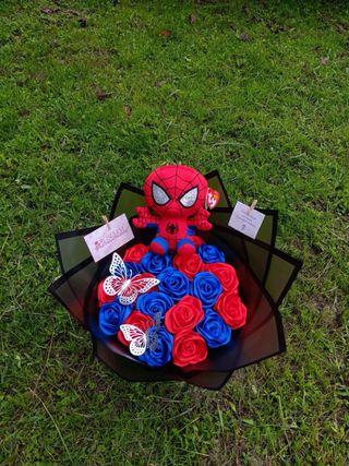Original ramo de flores artificiales en tonos rojo y azul, con un peluche de Spiderman. - Flores de tela satinada. - Adornado con mariposas blancas. - Incluye peluche de Spiderman. - Ideal para regalo.