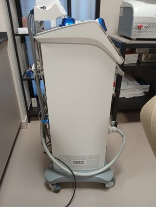 Máquina Thermasculpt de la marca GSD. Diseñada para tratamientos estéticos. - Pantalla táctil. - Mango con aplicador azul. - Botón de parada de emergencia.