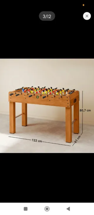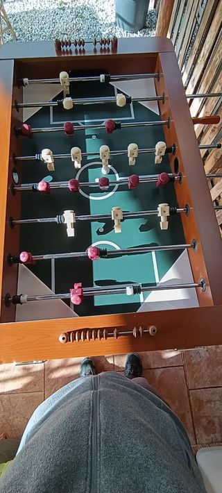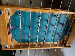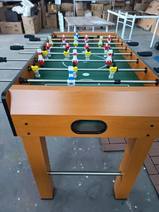 Futbolín de madera HOMCOM, ideal para niños y adultos. Diseñado para casa o salas de juego, es fácil de montar. - Modelo profesional con 8 barras. - Incluye 2 pelotas. - Dimensiones: 122x61x80,7 cm. - Color: Natural. Comprado el 18 de noviembre en amazon por 120€ para mi hijo, pero hemos reformado su habitación y ya no nos cabe, está como nuevo.