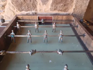 Futbolín de estilo profesional, listo para la acción. - Campo de juego verde con líneas blancas. - Figuras de jugadores en color rojo y verde. - Moneder restaurado entero