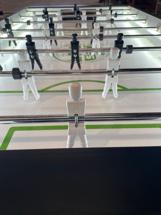 Futbolín profesional con un diseño moderno y robusto. Ideal para partidas. - Estructura blanca con detalles negros y verdes. - Barras metálicas con jugadores blancos y negros. - Iluminación LED integrada en la parte superior.