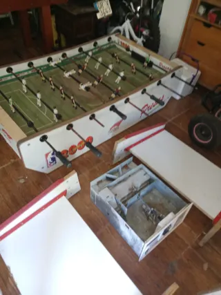 Futbolín de estilo profesional, ideal para disfrutar en casa o en espacios de ocio. - Estructura de madera robusta. - Campo de juego verde. - Barras con jugadores. - Asas de madera para el control. en las fotos aparece con mucho polvo ya que ha estado guardado muchos años . pero está en muy buen estado . tiene mucho polvo en las fotos pero está en muy buenas condiciones .