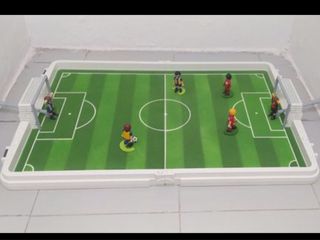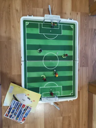 Juego de futbolín Playmobil en buen estado. Incluye campo de juego, porterías y varios jugadores. Ideal para divertirse en familia. - Campo de juego. - Incluye porterías. - Varios jugadores incluidos. - Le falta una pieza de uno de los porteros por eso el precio.