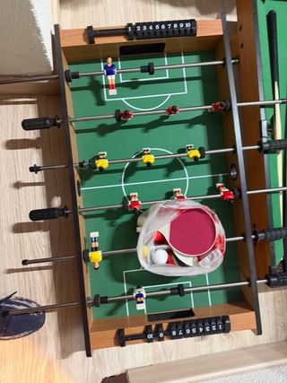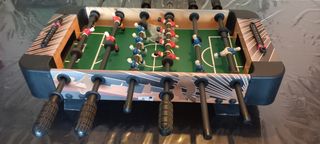 Futbolín de mesa para disfrutar en casa. Ideal para partidas rápidas y divertidas. - Diseño compacto y portátil. - Incluye dos equipos de jugadores. - Barras de metal resistentes.