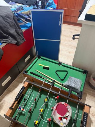 Set de juegos recreativos para disfrutar en casa. Incluye un mini futbolín, una mesa de mini billar y una mesa de mini ping pong. - Mesa de ping pong azul. - Mesa de billar verde con accesorios. - Mesa de futbolín con jugadores.