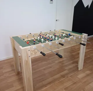 Futbolín de madera con campo de juego verde. - Estructura de madera clara. - Barras metálicas con jugadores. - Diseño clásico.
