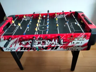 Futbolín que se convierte en mesa multijuegos. Se compone de 14 jyegos: billar, ping pong, ajedrez, damas... La anchura de la zona de juegos es de 60 cm. Contando los manillares son 80 cm. Tiene un jugador rajado, pero no afecta al juego. Se podría pegar o sustituirlo por otro. No se hacen envíos.