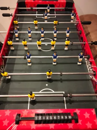 Futbolín de mesa con superficie de juego de cristal. - Diseño llamativo con detalles en rojo y amarillo. - Figuras de jugadores y barras metálicas. - Ideal para partidas divertidas. solo para recoger funciona muy bien
